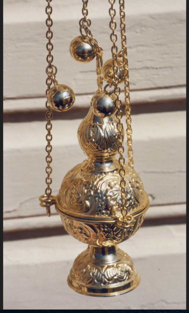Patrick lights the incense in the burner with a long wick. Father O’Byrne begins to swing it back and forth as they walk down the aisle.