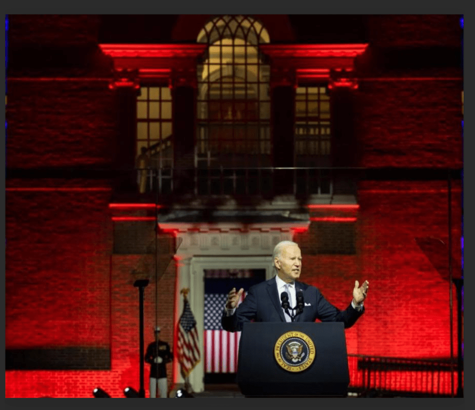Patrick: They tried it once. Remember when Biden gave his speech with all the red lights, black backlighting, and the two Marines in the background? That was Stephen King. It wasn’t very popular. People called it “Biden’s Nazi Speech.”