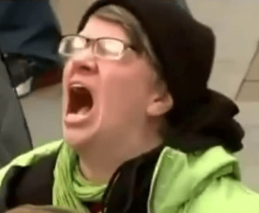 The next customer who comes through the door is dressed as the Anti-Trump Protester who screamed at the sky when Trump won the election in 2016. The woman has glasses and a stocking cap, and as she sees Trump in the booth, she screams at the ceiling as loudly as she can.