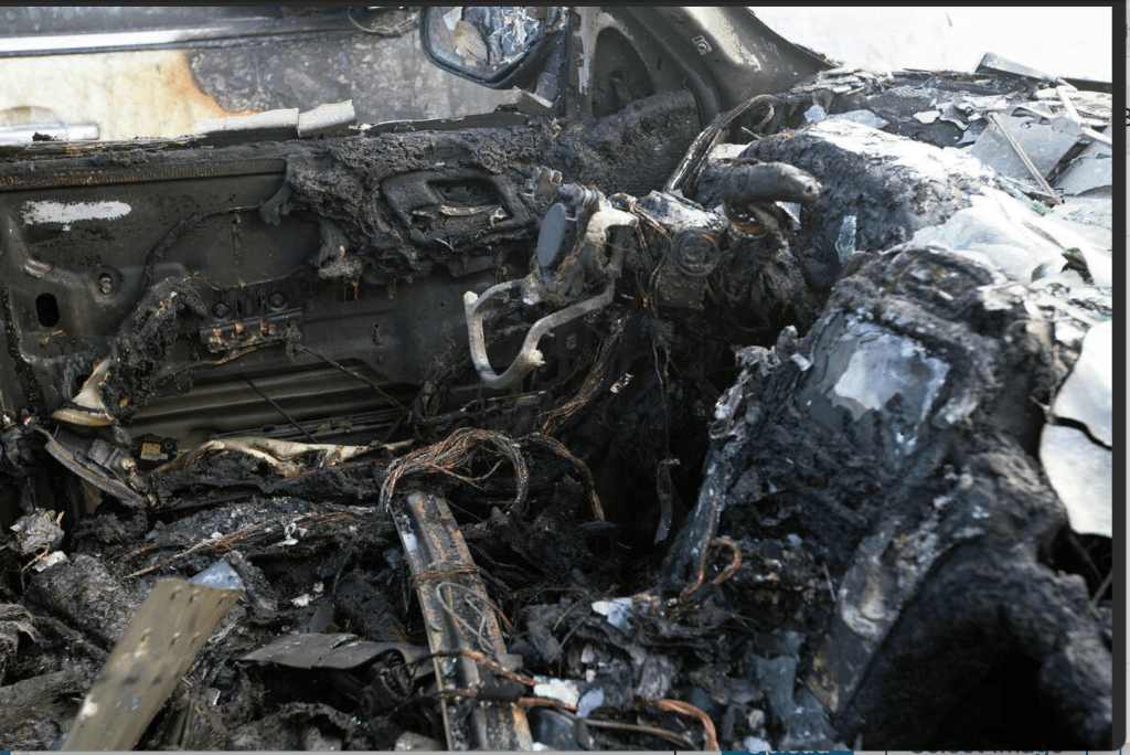 Patrick shows Timothy a photo of their burnt-out Caddy.