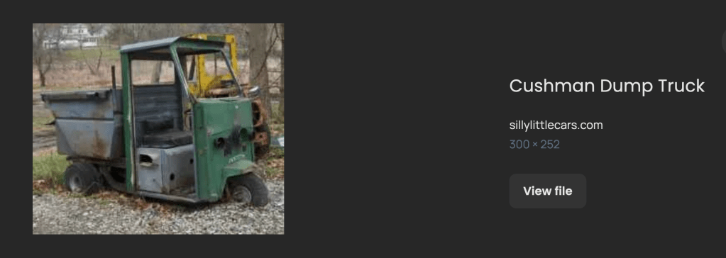 After two weeks, Decker told me that the Cushman dumpster was out of the garage (new clutch) and that I’d be driving that from now on.
