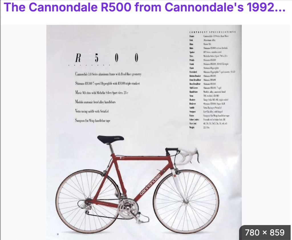 Pulling up next to me is a young woman on an orange Cannondale R500 racing bicycle. They were expensive, had the best gears, and only weighed 22.5 pounds. She had blonde hair and wore orange racing tights that said “Cannondale” on them. She was a serious bike racer.