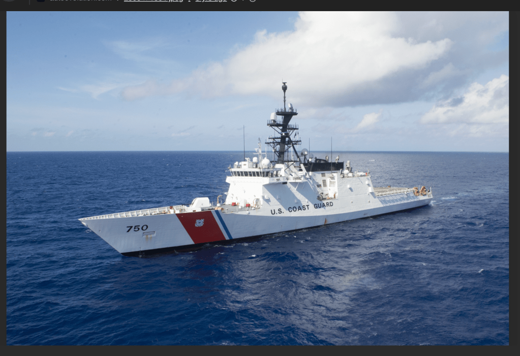 The cannon shot lands around the US Coast Guard cutter, with two of them banging off the steel hull and falling into the sea.